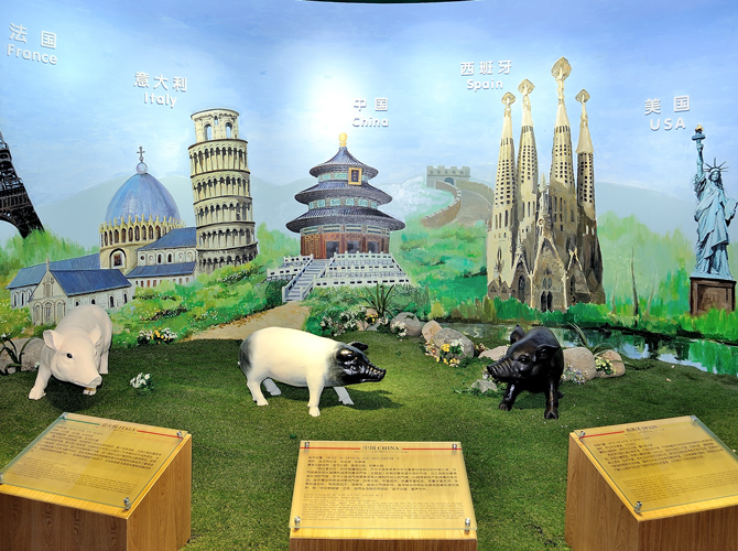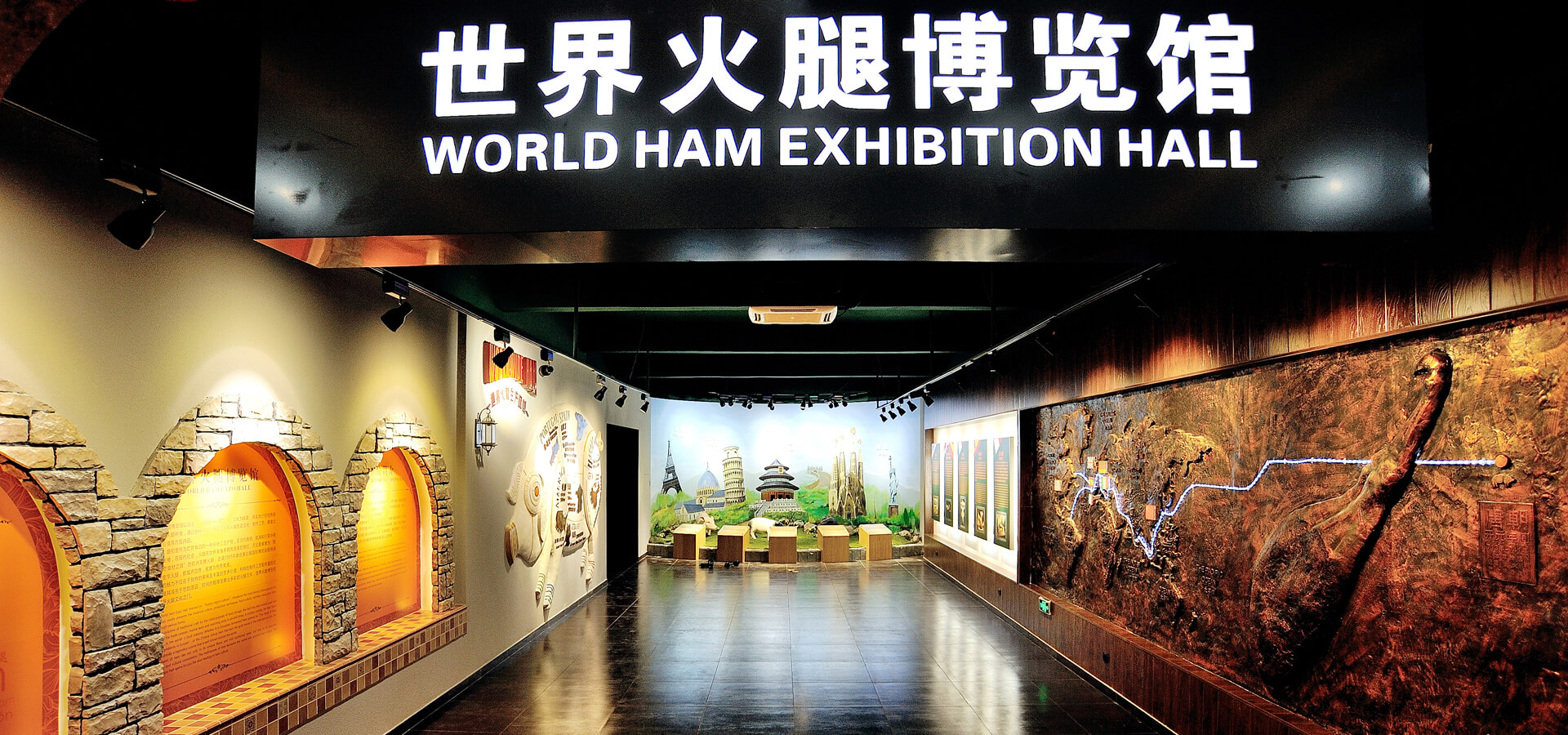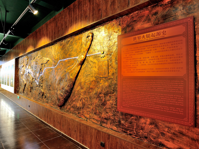 世界火腿博覽館是一個(gè)以世界火腿為主題的博覽館,用歷史-地域-工藝-文化為線索,通過展板、照片、聲光和布景等手法,翔實(shí)介紹了中國(guó)金華火腿、西班牙伊比利亞火腿、意大利帕爾瑪火腿、法國(guó)科西嘉火腿和巴黎火腿、美國(guó)的鄉(xiāng)村火腿等世界知名火腿的歷史人文,消費(fèi)習(xí)俗、制作工藝、火腿美食等。